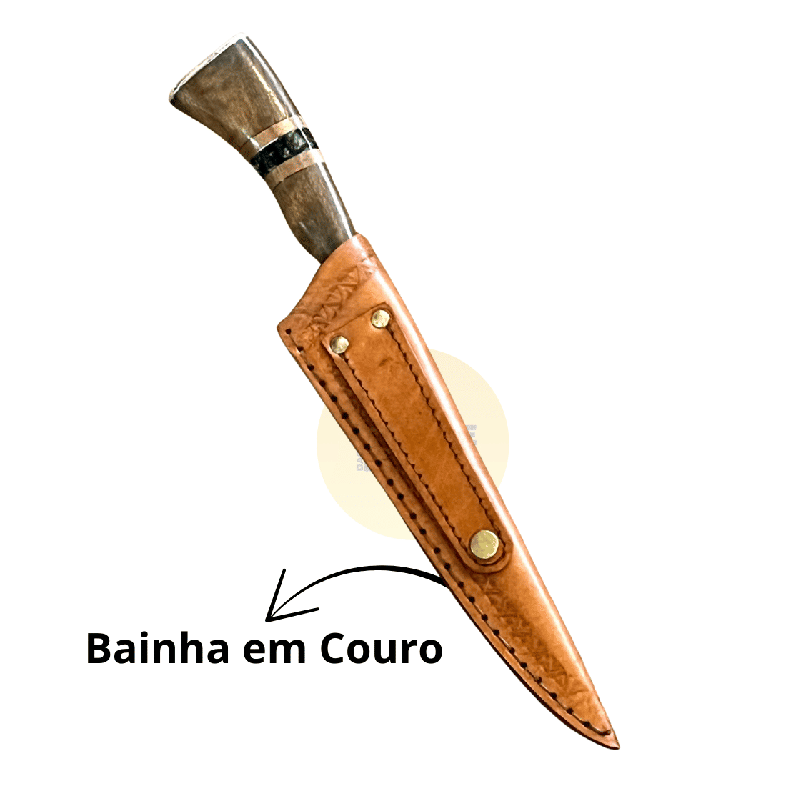 Bainha de Couro Legítimo: Acompanhada de uma bainha de couro legítimo, esta faca oferece proteção adicional e facilita o