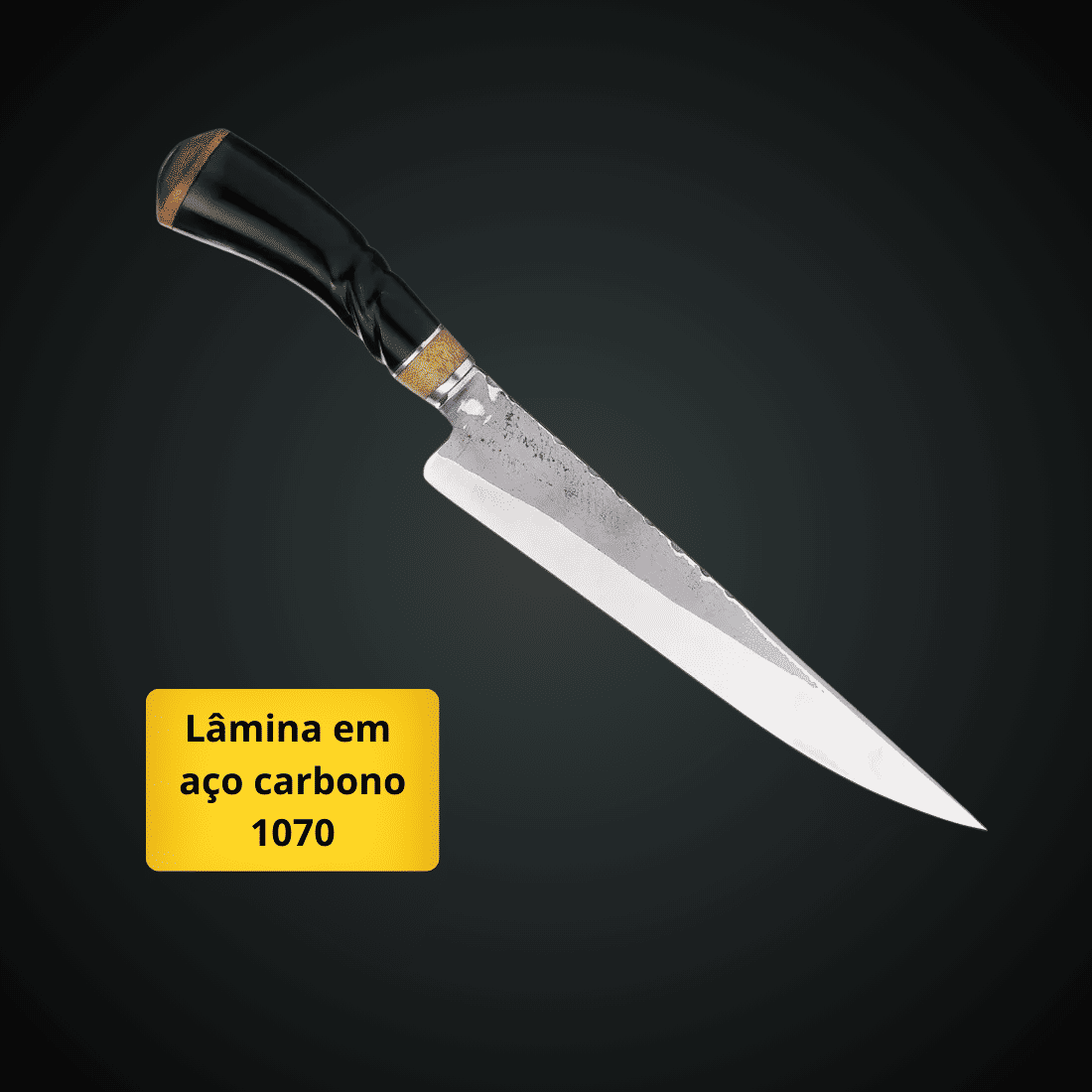 aço carbono 1070, oferece excelente retenção de fio e desempenho de corte superior, perfeita para uso no campo, no churrasco ou na cozinha.