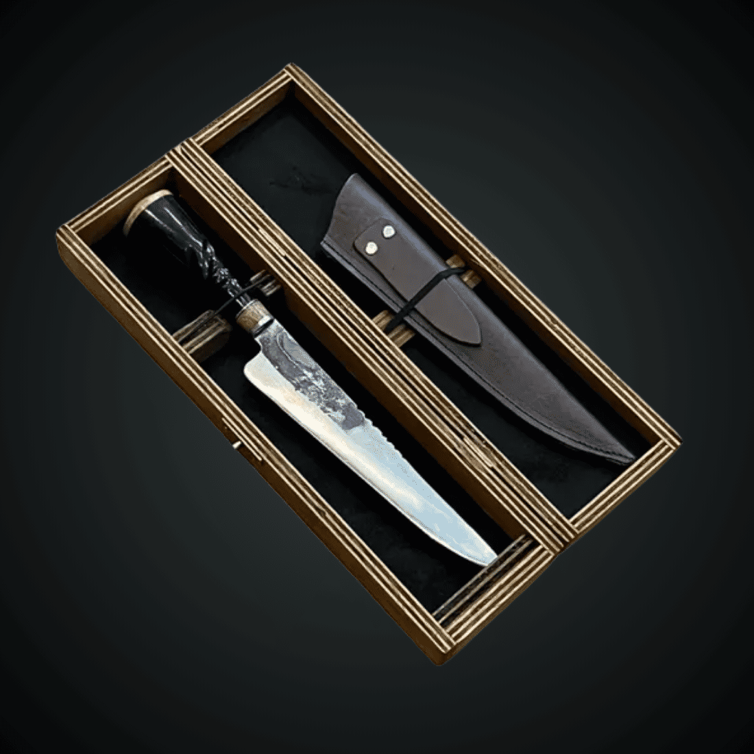 Sua lâmina robusta com acabamento Brut Forj traz uma estética rústica e elegante, com dorso de 3mm de espessura que reforça a durabilidade