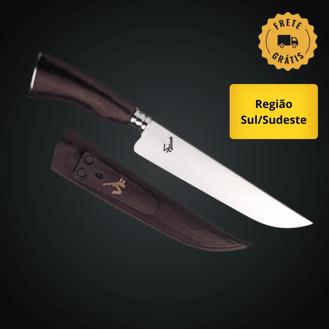 manusear. Para complementar, a faca acompanha uma elegante bainha de couro, proporcionando proteção e praticidade ao